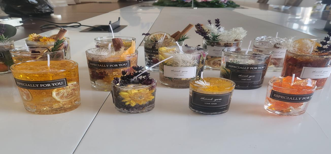 大家充分發(fā)揮創(chuàng)造力,經(jīng)過近一個(gè)小時(shí)的精心制作,一份份獨(dú)特的、充滿創(chuàng)意的香薰蠟燭完美的展現(xiàn)在我們面前。作品中香薰造型各異,也代表著大家不同的心境與體驗(yàn),鮮亮的橙色、清新綠色、淡雅的白色,花立于杯中,或安靜或?yàn)⒚?,給人以美的享受。